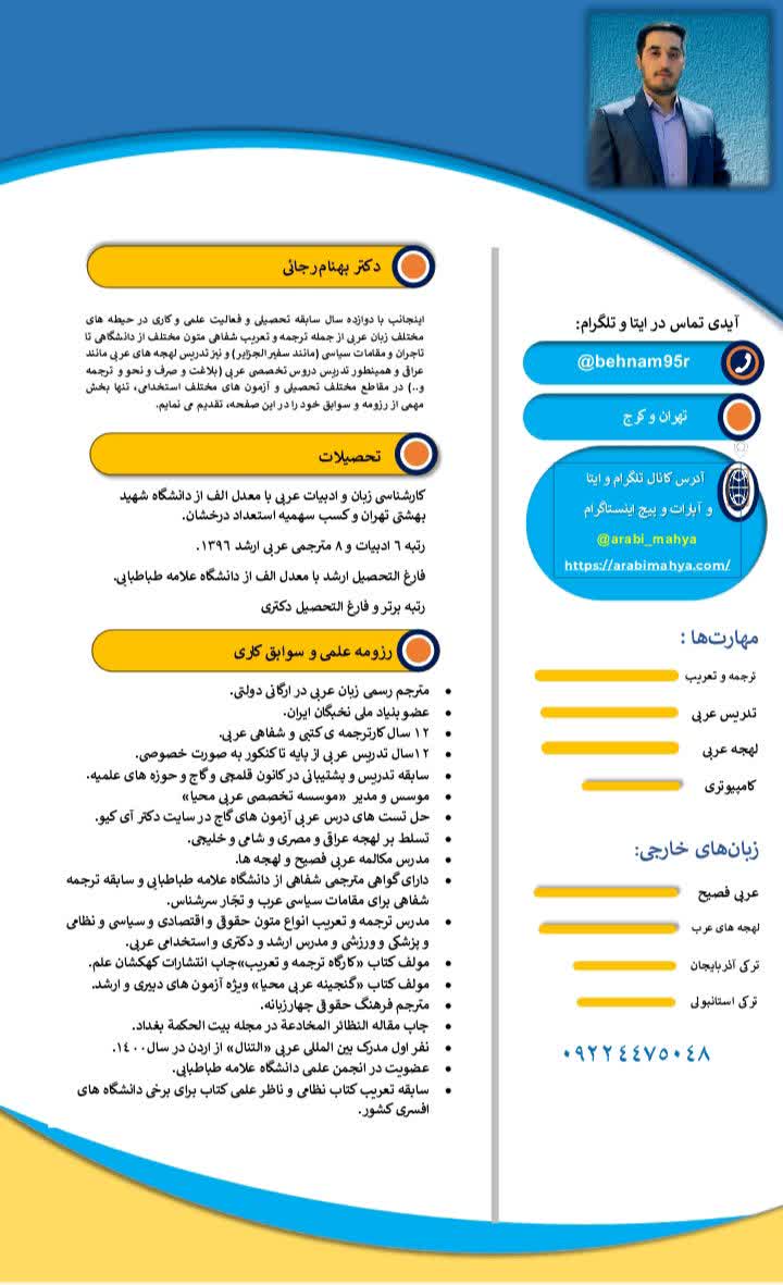موسسه عربی محیا با مدیریت دکتر بهنام رجائی رتبه برتر کنکور ارشد عربی و دکترای عربی، و مترجم رسمی زبان عربی و مولف کتاب «کارگاه ترجمه و تعریب»، در حیطه های تخصصی عربی از متوسطه اول و متوسطه دوم و کنکور سراسری و امتحانات نهایی، تا عربی تخصصی در سطح کنکور ارشد عربی و کنکور دکترای عربی و همچنین آزمون استخدامی دبیری عربی، و نیز تدریس و برگزاری دوره در دروسی همچون صرف و نحو، بلاغت، تاریخ ادبیات، ترجمه و تعریب، درک مطلب، لهجه های عربی مانند لهجه عراقی و لهجه شامی و مکالمه عربی فصیح و ارسال مترجم همراه و مترجم شفاهی و پذیرش ترجمه متون و فیلم و صوت عربی در انواع زمینه های خبری و حقوقی و اقتصادی و قراردادها و سیاسی و فرهنگی و تکنولوژی و نظامی و غیره فعال می باشد. سایت موسسه به عنوان اولین مرجع معتبر مشاوره و ارائه منابع و کتب و برگزار کننده دوره های مذکور، در دسترس زبان آموزان و دانشجویان و اساتید محترم است.